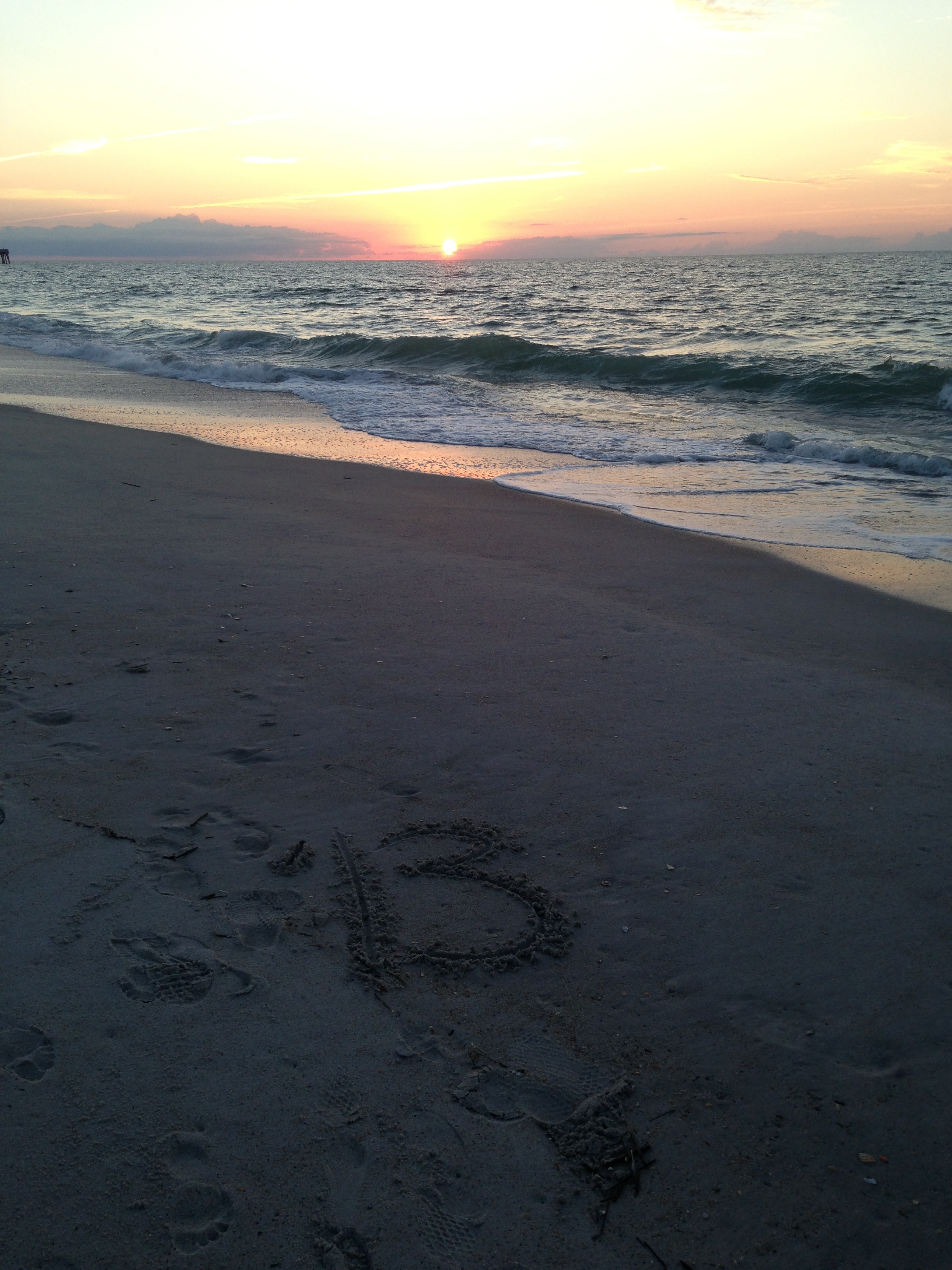 After the song ended last Thursday, I sat there on the pier and flipped through my pictures at sunrise the previous day. I’d gone to great lengths to take one of the number “13” written in the sand. Two years prior, at the beach on a work trip, I’d written the number 12. Stressed and burnt out, I’d wanted the number to remind me that in 2012, I’d get to go back to school and follow my passion. The photo set as my phone backdrop motivated me throughout the following year, but I realized this year that 2012 was still my backdrop, which didn’t seem right. Whatever the significance of 2013, I had to embrace that, and change the picture accordingly. So I did. After a few snapshots of just the sunrise and the sand, I used my pointer finger to trace a gigantic “13.”